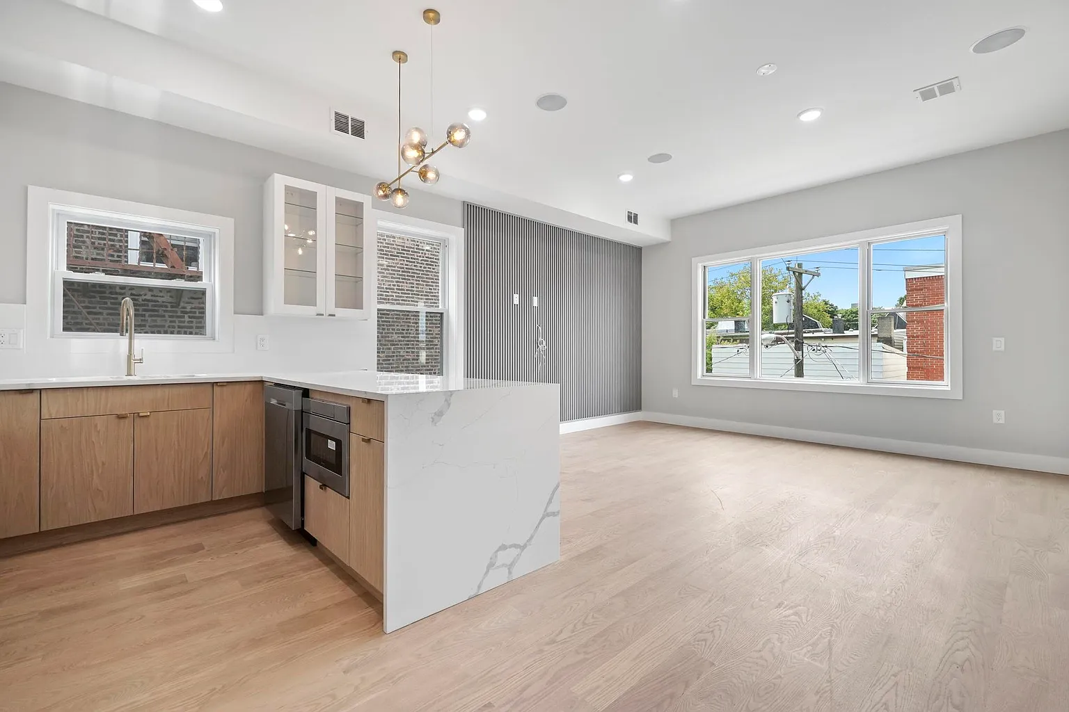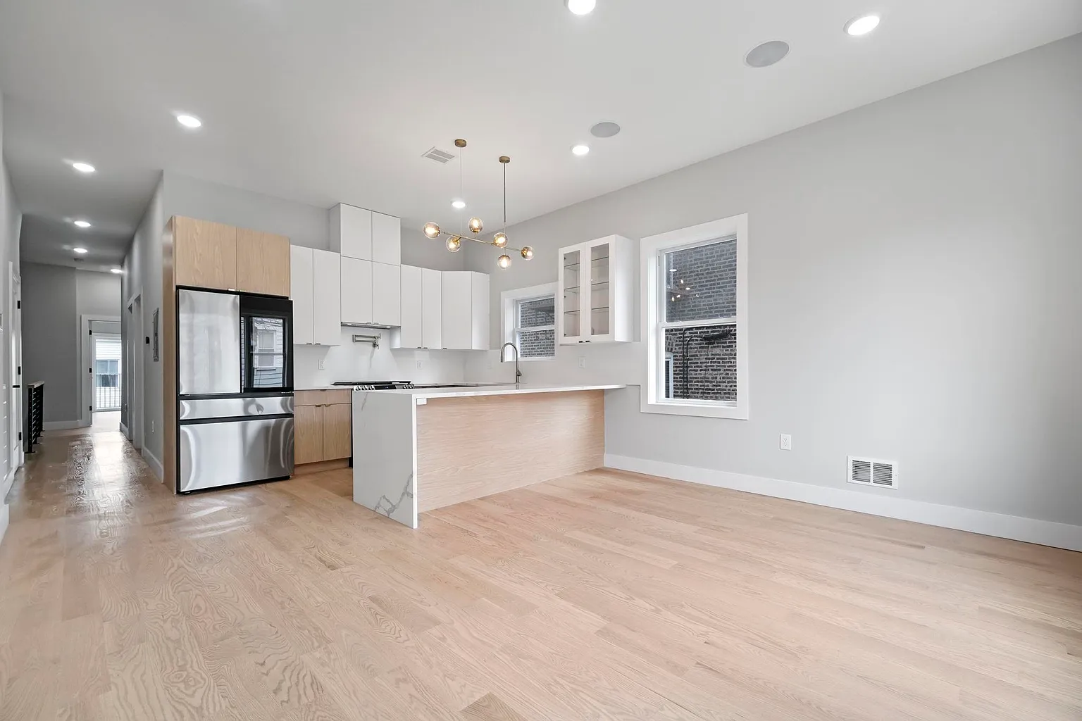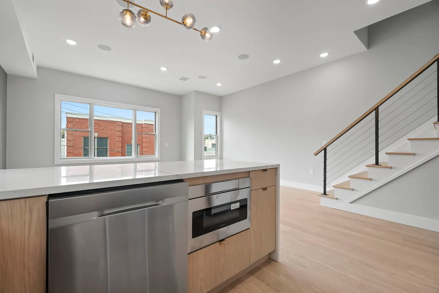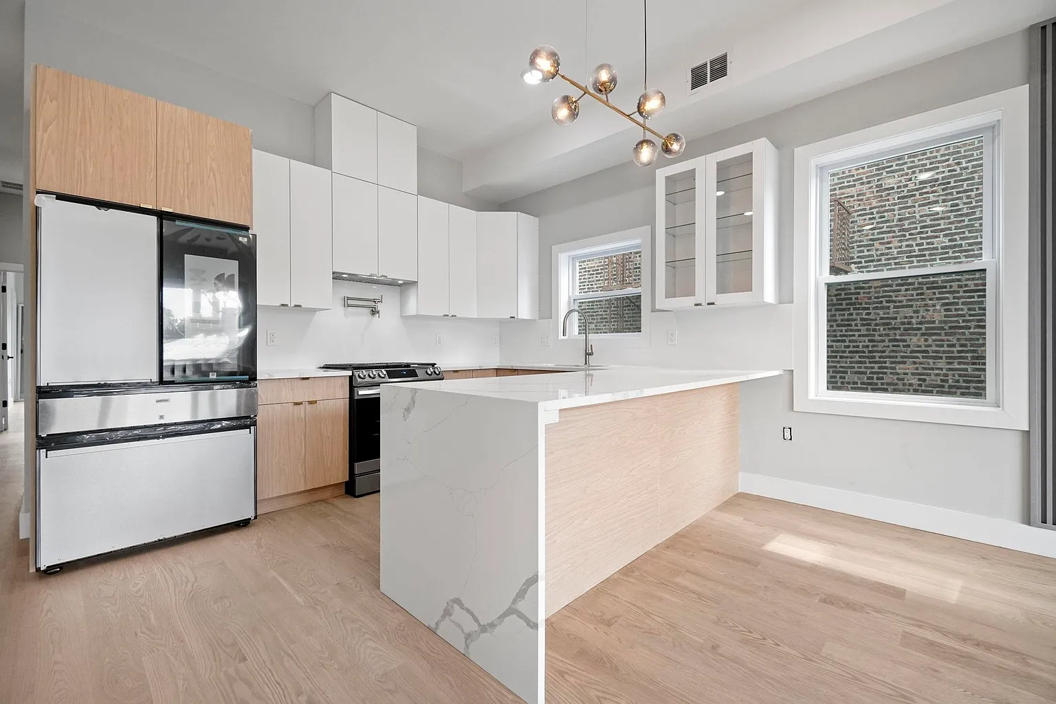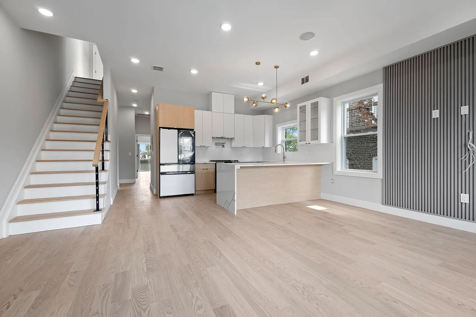 This contemporary multi-family home showcases expansive open-concept living and dining areas with soaring 10-foot ceilings and walls of windows that flood the interiors with natural light. Each chef-inspired kitchen features top-line cabinetry, smart stainless-steel appliances, a dramatic waterfall quartz island, and porcelain backsplashes with accent lighting, creating a refined yet practical cooking space.