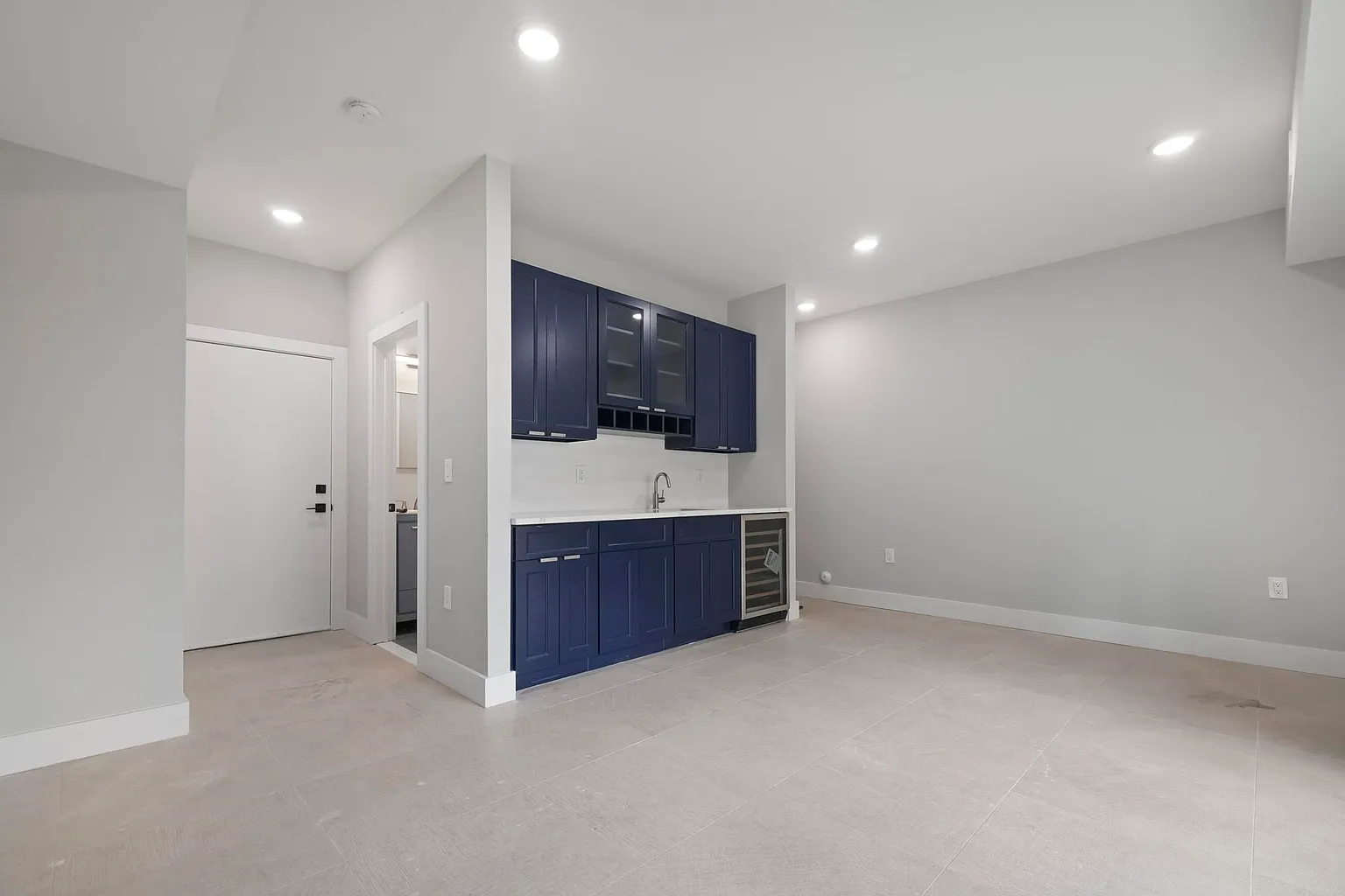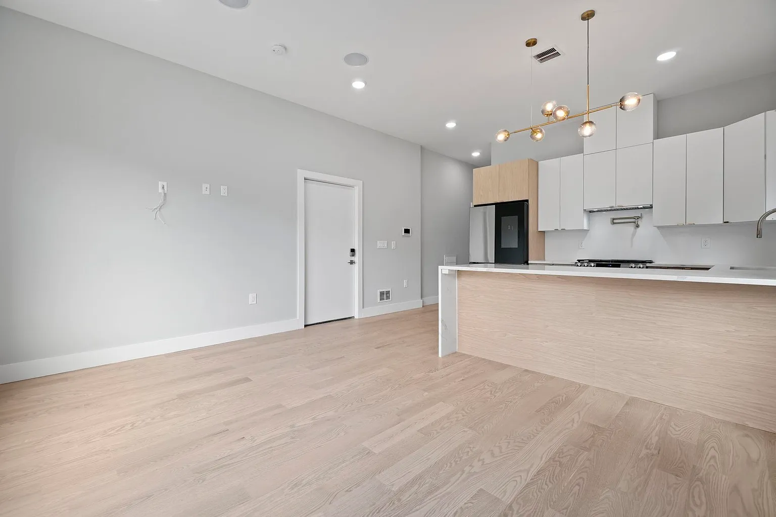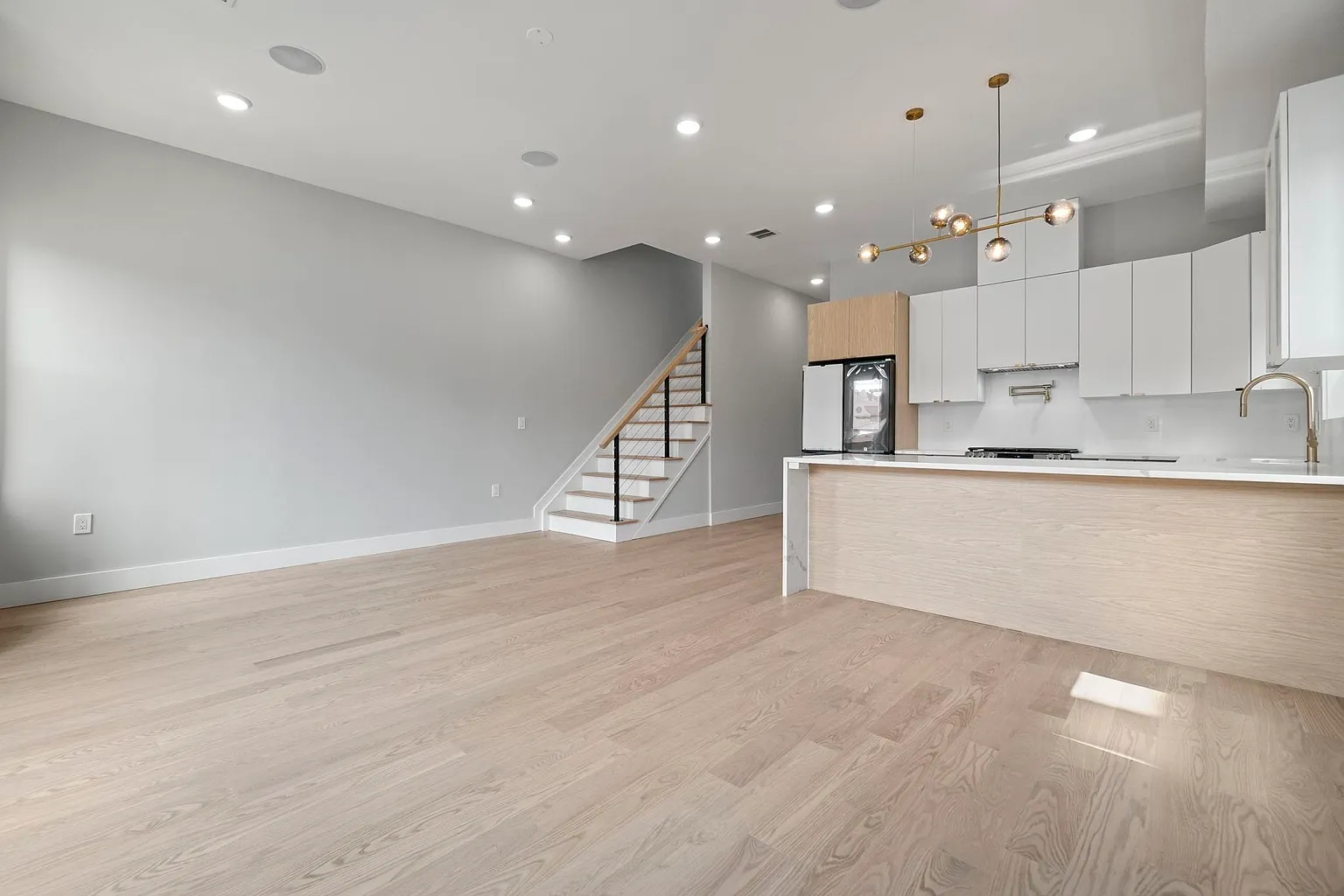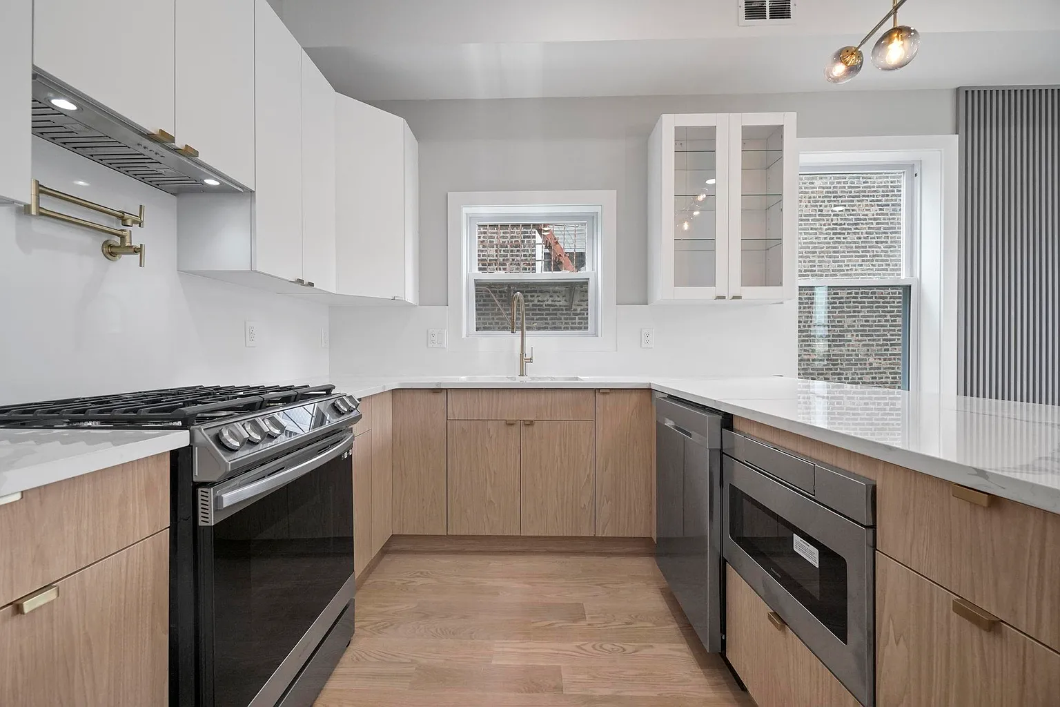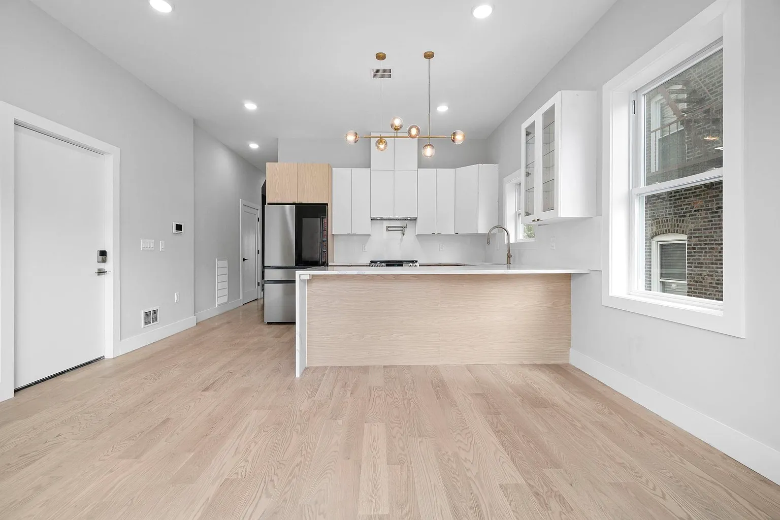 This contemporary multi-family home showcases expansive open-concept living and dining areas with soaring 10-foot ceilings and walls of windows that flood the interiors with natural light. Each chef-inspired kitchen features top-line cabinetry, smart stainless-steel appliances, a dramatic waterfall quartz island, and porcelain backsplashes with accent lighting, creating a refined yet practical cooking space.