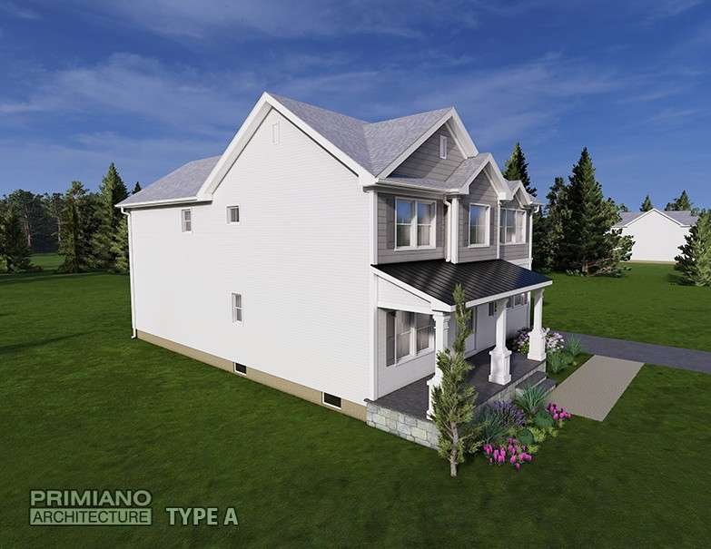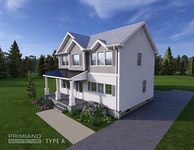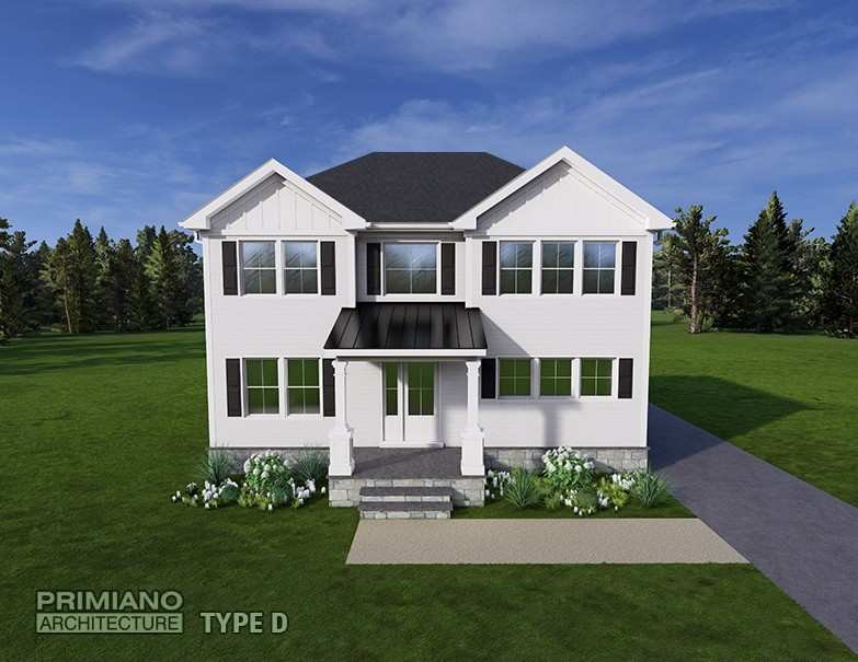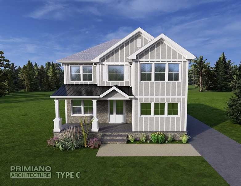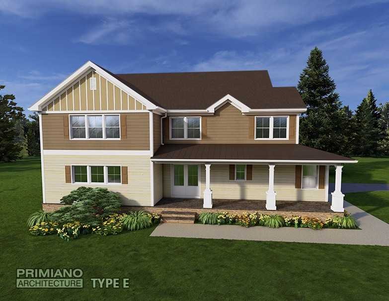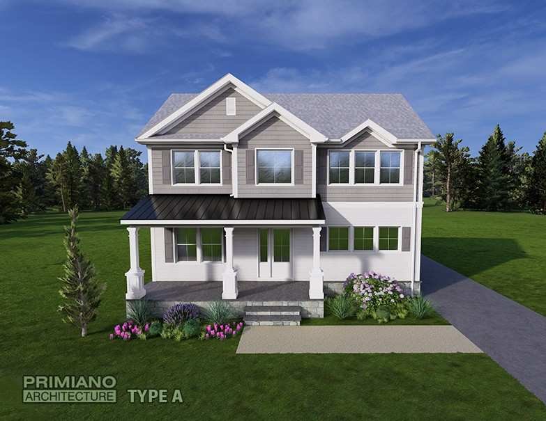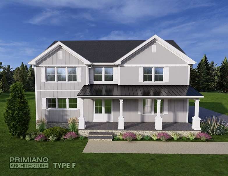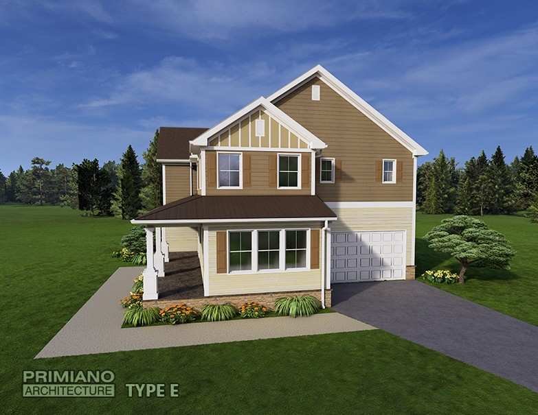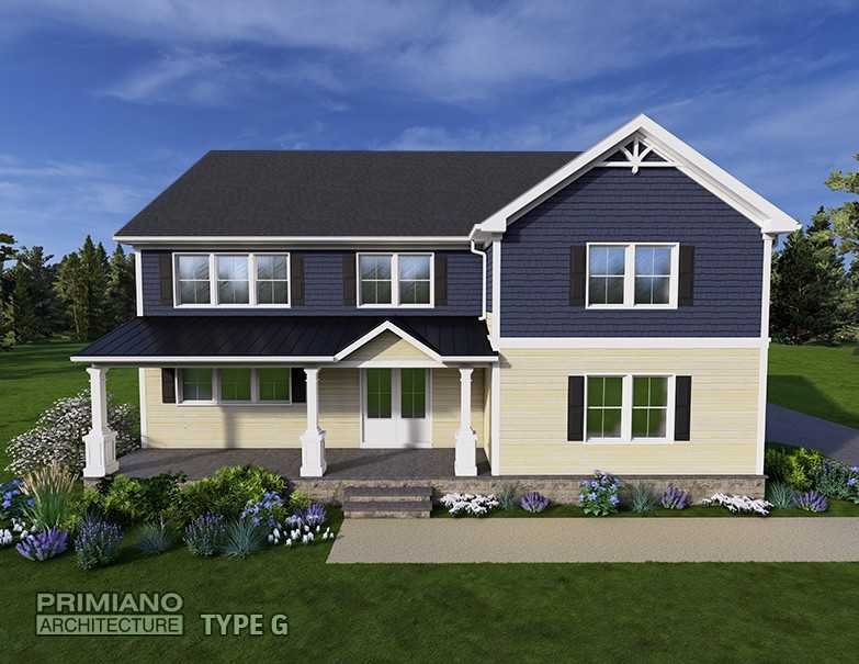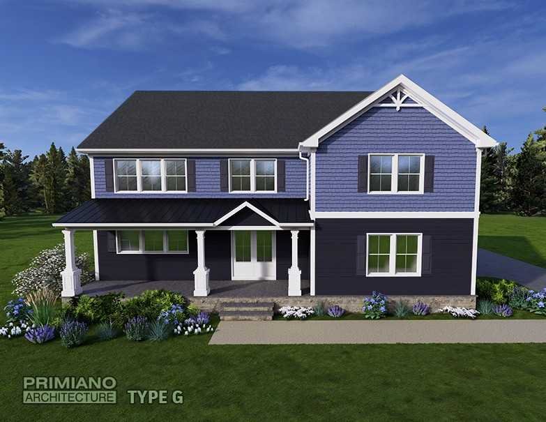 The Bentley residence showcases a beautifully balanced façade featuring traditional gabled rooflines, refined siding finishes, and a welcoming covered front porch that enhances curb appeal. Its clean architectural symmetry and thoughtfully landscaped surroundings create a warm yet sophisticated presence.