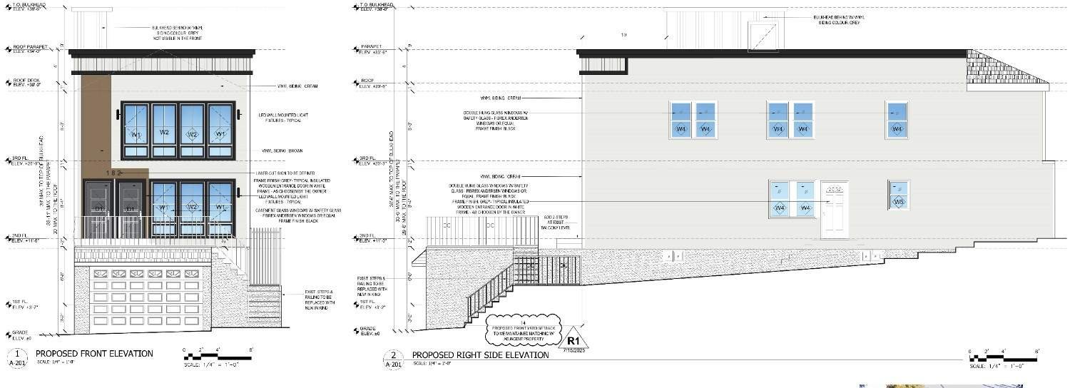 This development involves the renovation of a three-story frame dwelling, including the addition of a new upper-level expansion to increase living space and overall property value. The updated front elevation introduces a refreshed façade featuring modern siding finishes, upgraded windows, enhanced lighting fixtures, and a redesigned entry with contemporary detailing.